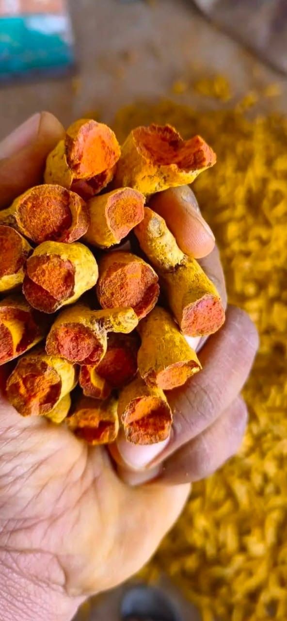 Turmeric fingers are the whole, dried rhizomes (underground stems) of the turmeric plant after cleaning, boiling, and drying. They are not ground into powder—the “finger” refers to the shape of the individual rhizome pieces.